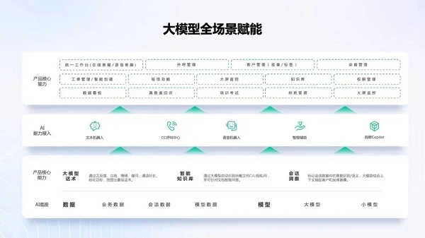面接入智能知识库、智能语音机器人、文本机器人、大模型话术库(坐席辅助、营销辅助)等,赋能客服中心智能化升级。