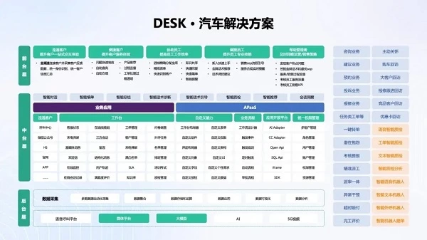 容犀DESK在传统客服工作台之上,引入更多的营销触达、用户洞察、大模型能力赋能,并结合“银行业、保险业、证券业、汽车业”四大行业实践Knowhow,更大化融合用户、服务、营销、业务之间的链接,升华服务大生态的价值链,实现前所未有的数智驱动、用户洞察、管理升级的生成式智能营销服一体化工作空间。