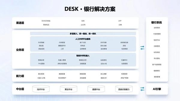 随着银行业的传统在线客服向互联网在线客服转型,为帮助银行业为客户提供更优质的服务,容犀DESK为银行业定制一体化的智能营销服解决方案,在传统的客服平台之上,增加服务营销一体化闭环能力,通过统一工作台,融合用户服务、营销触达、用户运营分析系统,助力行方提升全渠道客户服务能力,拓展服务渠道,提升服务效率与服务质量,最终实现客服部门的营收效益。