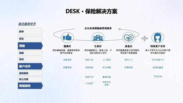伴随保险客户的需求不再局限于传统的理赔和保障,而是转向了全生命周期健康管理服务与关怀。容联云洞悉这一趋势,打造容犀DESK为保司提供“全生命周期的精细化用户营销服一体化工作台”,在保单生命周期及其前续和后续阶段,在客服侧,打造“差异化服务”,快速解决客户的个性化需求,提升客户满意度。在营销侧,打造“全媒体数字化互动”,不断扩展覆盖保险价值链的各类保单服务与增值服务。内外合力更大化推动保司营销服大生态建设。