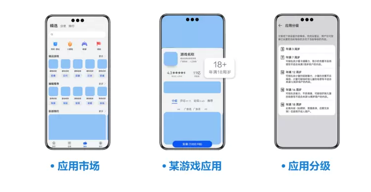 对于缺少风险辨别能力的未成年人,华为应用市场也有相应的应用年龄分级内容的管理,2023年,年龄分级能力再次优化提升,根据不同年龄阶段未成年人的身心发展特点和认知能力,对游戏应用进行精细分级管理。用户打开游戏详情页面,即可查看游戏适龄年龄,点击适龄年龄提示,查看年龄分级说明页面,选择适合未成年人的下载使用的应用,帮助家长管理管控好未成年人身心健康。