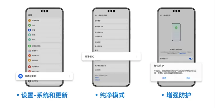 对应用管控的同时,用户下载使用过程中的安全守护也毫不松懈。2023年,华为应用市场迭代了安装保护、运行保护两方面安全保障能力。部分被华为应用市场上架审核 “拒之门外”“的应用,常常以另外一种用户不易识别的方式出现。针对这一风险,2023年,华为应用市场新增了恶意应用渠道提醒和违法违规类应用提醒,未知来源的应用在安装环节,就会被华为应用市场检测并识别风险及时告警,保障用户安装应用的安全。同时,用户可以开启纯净模式增强防护功能,开启后,仅支持安装经过华为应用市场检测的应用,已安装但检测出存在风险的应用也将无法运行。