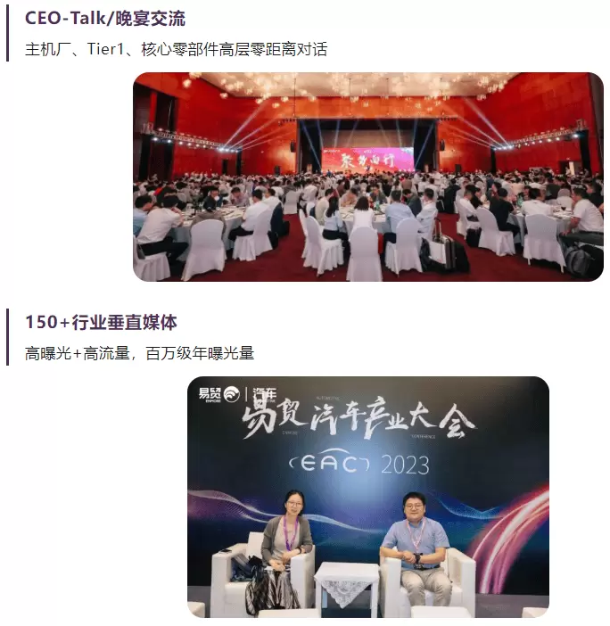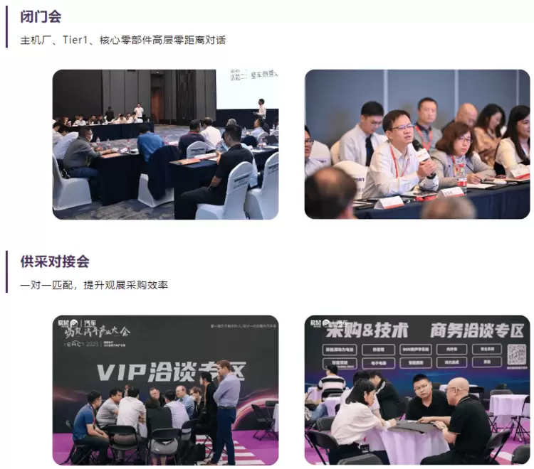 EAC2024现场搭建采购对接洽谈区帮助参展商寻找对接商机,终端买家采购团组队巡展。聚焦主机厂最关注的产品,对接主机厂技术、采购、质检等多部门,跨域融合邀请主机厂总监以及副院长级亲临展会现场,决策者与实际使用者与您1V1交流。