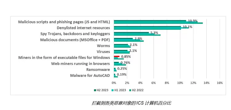 一个令人担忧的发现是,与2023年上半年相比,在2023年下半年,拦截到Windows可执行文件的挖矿软件的ICS系统在全球范围内增加了1.4倍。这凸显出威胁行为者采用的策略不断演变,他们越来越倾向于利用漏洞并利用ICS基础设施来为自己谋取经济利益。此外,这可能意味着攻击者的重点正在转向更隐蔽的利用技术。