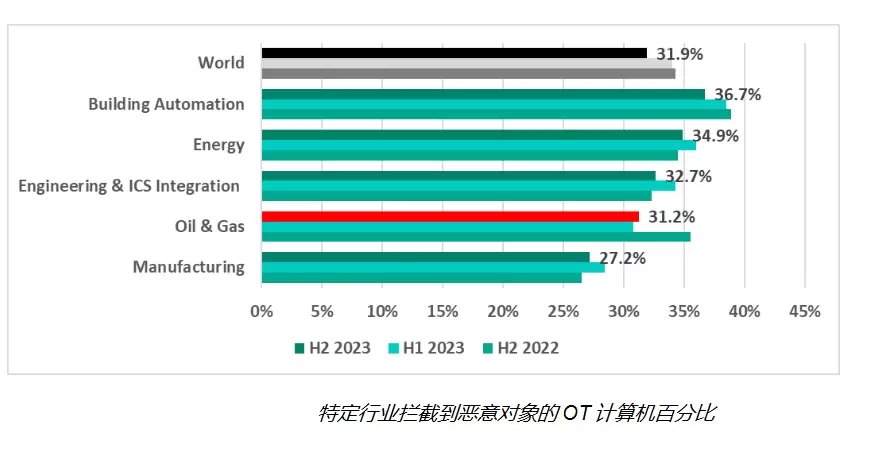 该报告还以特定行业为重点,指出楼宇自动化是遭受攻击最多的行业(2023年下半年:拦截到恶意对象的比例最高)。石油和天然气部门呈现出波动趋势,在经历了一段时间的下降后,在2023年下半年攻击数量略有增加。