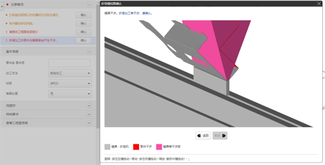 而在钣金加工服务方面,米思米meviy 智能报价平台则支持激光切割、数控冲下料等多种加工方式。并且当用户上传钣金零件数据信息后,平台在报价的同时还会判断加工的可行性,一旦上传的零件数据超过加工极限或存在模具干涉,平台就会提醒设计师及时修改数据,避免返工和原料浪费的情况。