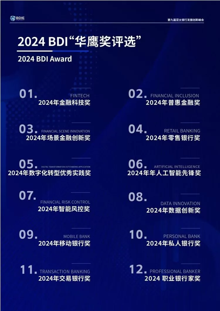 4月25日当天,将举办2024BDI华鹰奖颁奖晚宴,颁发年度金融科技奖、移动银行奖、职业银行家等奖项。