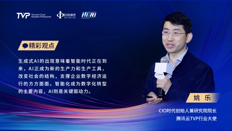 接下来,CIO时代创始人兼研究院院长、腾讯云TVP行业大使 姚乐为本次大会进行致辞,并发表题为《AIGC时代的数字化转型》的演讲。姚院长深入分享了AIGC时代下数字化转型的新特点与独特见解,详细阐述了AIGC的兴起、其所带来的重大机遇以及未来可能的发展趋势。他的分享为我们更好的应对因新技术快速更迭所带来的挑战,提供了宝贵的启发和思考方向。