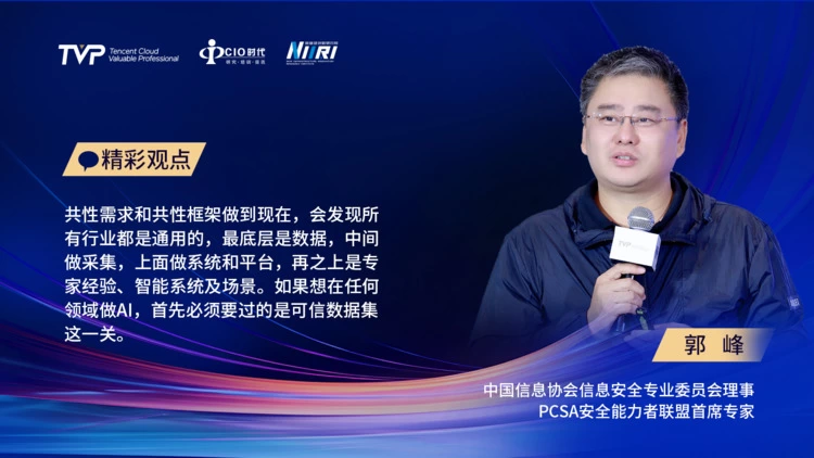 中国信息协会信息安全专业委员会理事、PCSA安全能力者联盟首席专家 郭峰为我们带来《数字化安全:主要挑战,效能提升,价值凸显实践案例分享》。他提到数据在未来会变成像银行里的钱一样珍贵,应该被保护起来。一般企业共性需求金字塔的底层都是数据,中间做采集,上面做系统和平台,再之上是专家经验、智能系统及场景。如果想在任何领域做AI,首先必须要过的是可信数据集这一关。
