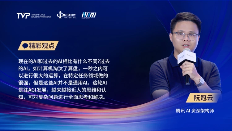 最后,腾讯AI资深架构师 阮冠云的演讲《AI大模型助力企业数字化转型》聚焦在人工智能及其在业界的发展和应用。他指出,AI如今不局限于特定任务领域的应用,而是逐渐向AGI(通用人工智能)转型,能够更深入地融入日常生活与工作,如利用AI技术制作的电影《终结者2》和在各行各业中AI应用的突破,彰显了AI技术的广泛应用范围和日益增长的能力。