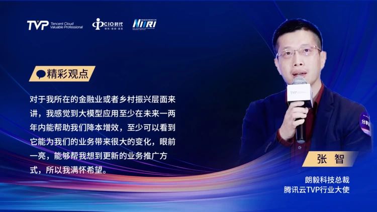 在本次圆桌会议上,多位行业专家分享了对AIGC大模型技术的理解及其在不同行业中的应用现状。他们的讨论涉及了AI技术的实际应用、行业挑战和企业数字化转型过程中的关键考虑因素,由CIO时代联合创始人兼COO、新基建创新研究院秘书长刘晶担任圆桌主持,腾讯云TVP行业大使、中顺洁柔CIO杨森林,腾讯云TVP行业大使、科进医疗软件总经理、祈福集团信息中心总监 何雪峰,腾讯云TVP行业大使、广东省CIO协会副会长 陈东锋和腾讯云TVP行业大使、朗毅科技总裁 张智共同参与。