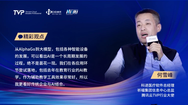 科进医疗软件总公司负责人何雪峰:作为一个长期在医疗行业工作的医信人,我认为大模型在AI领域的最大挑战还是数据获得,受等保要求和数据安全考虑,国内大多数医院的各种诊疗数据并不存储在云端。因此,当我们向医院提供服务时,通常会将系统部署在医院内部,帮助解决管理问题。站在甲方的角度看,我们看到企业家、管理层、一线人员对AI的看法和反应其实完全不同。企业家期盼AI的落地,帮助企业带来长期的降本增效;管理团队更务实,要评估引入AI相关软硬件方案对当年的盈利目标、经验成本是否有影响;一线人员则看到的是职位的危机,进而不同程度的抵触。