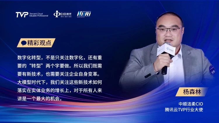中顺洁柔CIO杨森林:在我看来,AI将成为未来的主流技术。尤其是在小微企业和特定细分领域中,生成式AI可能成为核心。对于大型企业而言,我们更重视高性能的产品。而决策性AI在大消费行业的应用,我认为是未来的关键。结合传统功能系统和AI的探索,对技术进步至关重要。