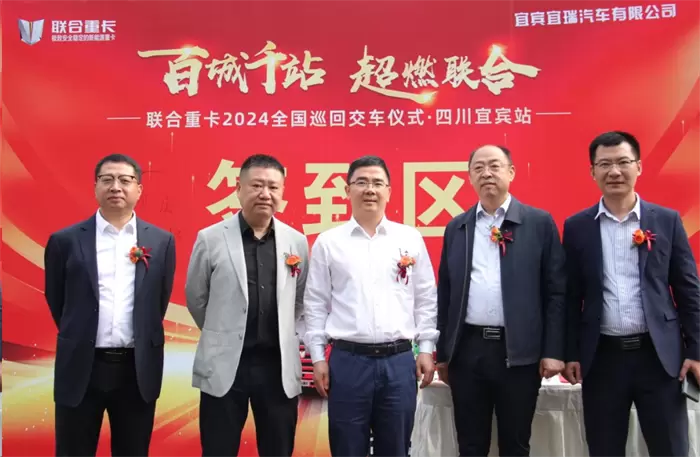 2024年3月27日,以“百城千站 超燃联合”为主题的联合重卡2024全国巡回交车仪式首站,在万里长江第一城宜宾圆满召开,市政府领导,三江集团三江绿城公司董事长、宜行科技公司总经理李貌,宜行绿电公司执行董事吕勇,宜行绿电公司总经理樊华,联合重卡新能源营销公司总经理许静波、宜宾宜瑞营销公司副总经理聂开武,以及多家行业客户、行业媒体共同出席交车仪式,现场交付新能源重卡30台,包含20台纯电动牵引车和10台纯电动搅拌车。