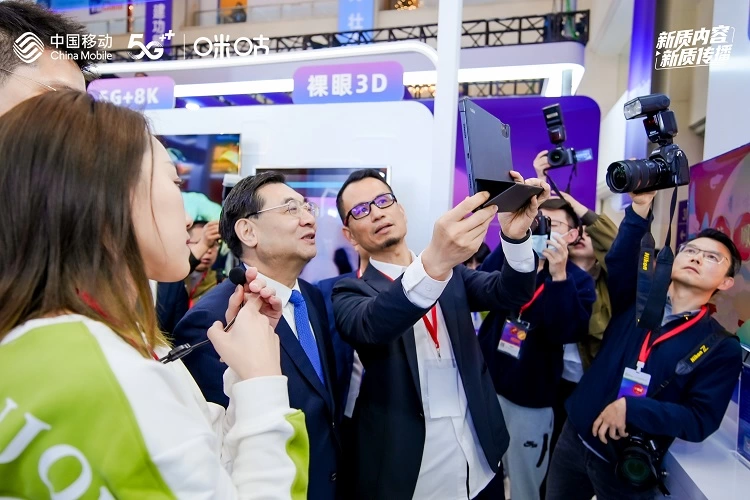 中央宣传部分管日常工作的副部长胡和平莅临参观中国移动咪咕展区,重点体验AI原创数智人视频彩铃,通过AI技术即时生成了专属数智人视频彩铃,感受了AI+移动融媒的最新成果;现场观看指导传统经典大戏《龙凤呈祥视频》云演播、体育赛事裸眼3D新看法等新质内容,对中国移动推动新质生产力赋能网络视听产业高质量发展表示充分肯定。