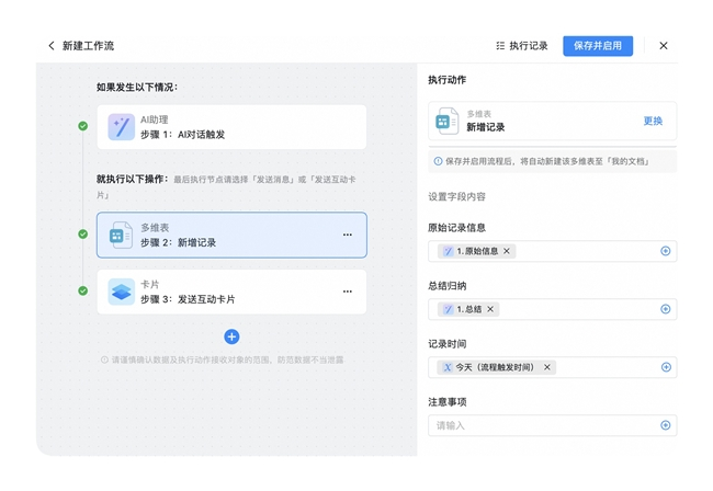 为降低用户的使用门槛,钉钉官方还提供了多种工作流模板。已有企业使用工作流创建了门店信息收集助理,将用户反馈自动化整理,并存储到一张钉钉多维表中,帮助员工节约琐碎的时间;个人用户也通过连接微博API,创建了自动追踪热点并撰写文章的助理,一个指令就能批量执行,大幅提升内容生产的效率。