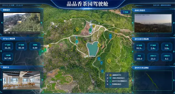 通过农业小气候一体机、茶树长势监控站、茶叶本体生理监测系统等软硬件,品品香茶园对茶叶生长环境进行实时监测与智能分析,辅助茶园生产管理,实现提质增效目标;采取茶园信息实时监控,对基地以及联合体茶信息进行实时监控、对在茶园进行违规喷药、除草行为的茶农进行监控,保证茶叶种植过程科学管理;立体化构建品品香茶园驾驶舱一张图,展示茶园全貌,实时感知园区情况,辅助企业精细化管理和智能决策。