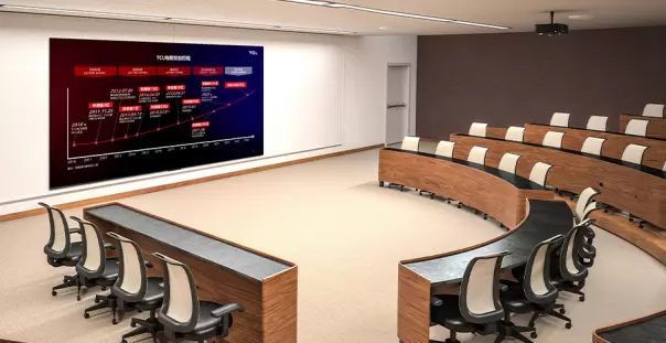 TCL为此专门打造了两个系列的办公大屏,其中M系列包含了M55A、M75A、M98A三个常规尺寸,可以满足各种中小型会议室的需求,M75A、M98A简直是替代传统投影的神机;而E系列则拥有全球最大的LCD办公大屏115E60,有115寸的超大巨幕,足以满足展厅、大型培训室的大屏需求。