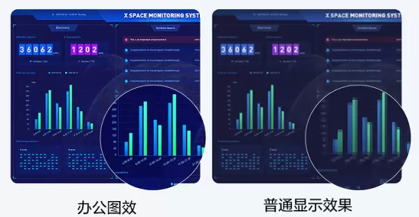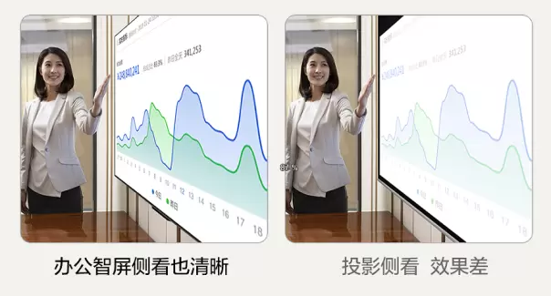 一场办公会议通常要耗时1小时甚至2小时,而譬如培训、市场、广告等从业人员或者企业中高层,一天之内可能需要参与多个会议,看四五个小时以上的PPT是常有的事,传统液晶办公大屏和投影仪因为有对比度差、清晰度差、亮度低、抗反光效果不好等不足,常常让长期参会的人员眼睛干涩疲劳,开会体验不佳,效率也不高。