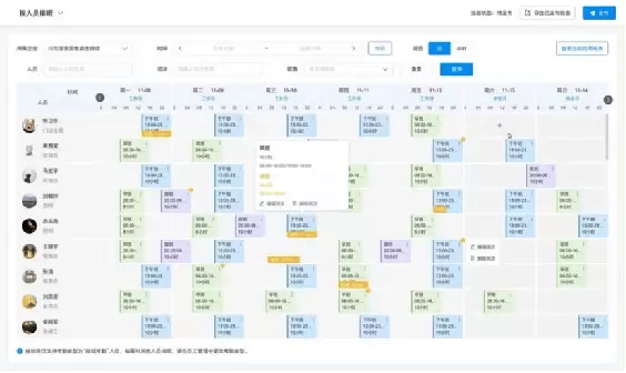 3、实时按需调配: 当企业排班计划因为员工请假、门店高峰期人手不足等各式各样突发情况需要调整时,支持员工主动进行换班、代班等各类申请,也支持门店长在线发起人员调配,实时更新并同步排班信息。