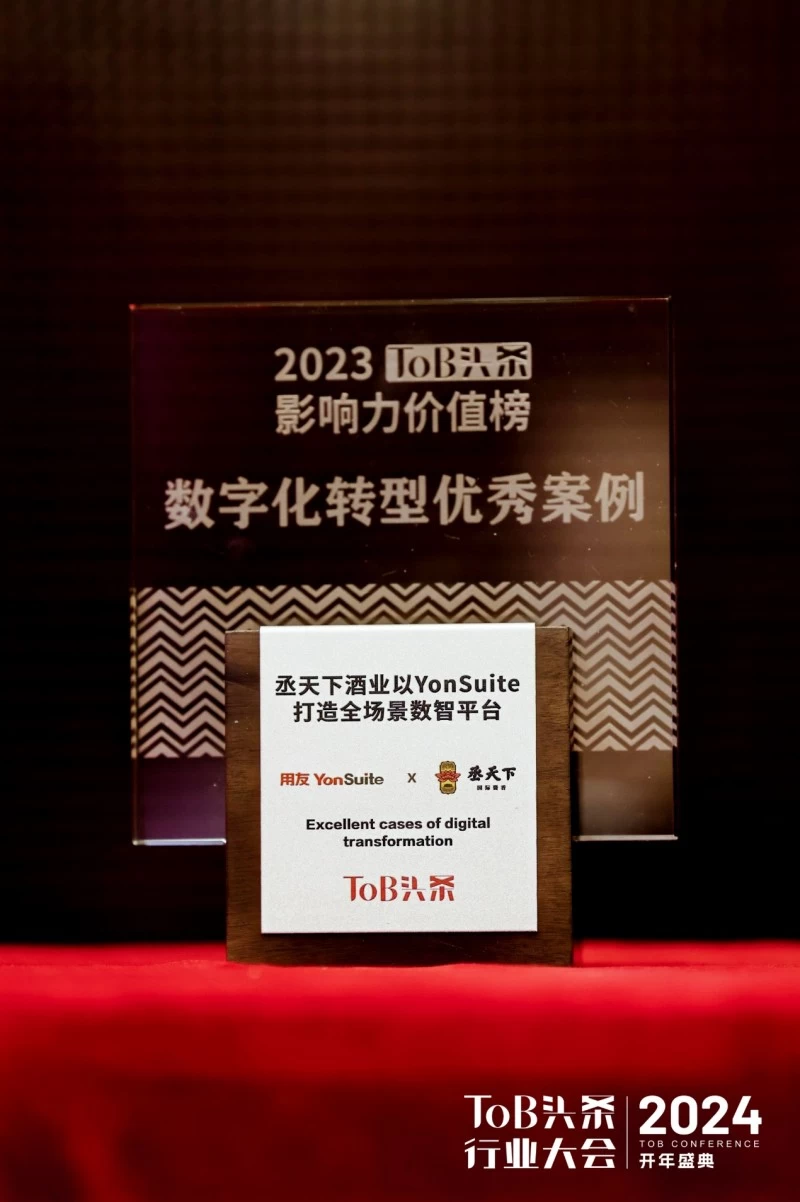 本次大会也从技术先进性、案例代表性、行业推广性等多个维度对多家厂商服务的企业案例进行综合评判,最终从报名及推荐参选的百家案例中,遴选出15个优秀数字化转型案例。用友YonSuite服务企业丞天下酒业集团凭借着营销、财务、供应链等管理领域的数智化创新,一举荣获《2023中国ToB行业影响力价值榜·数字化转型优秀案例》。