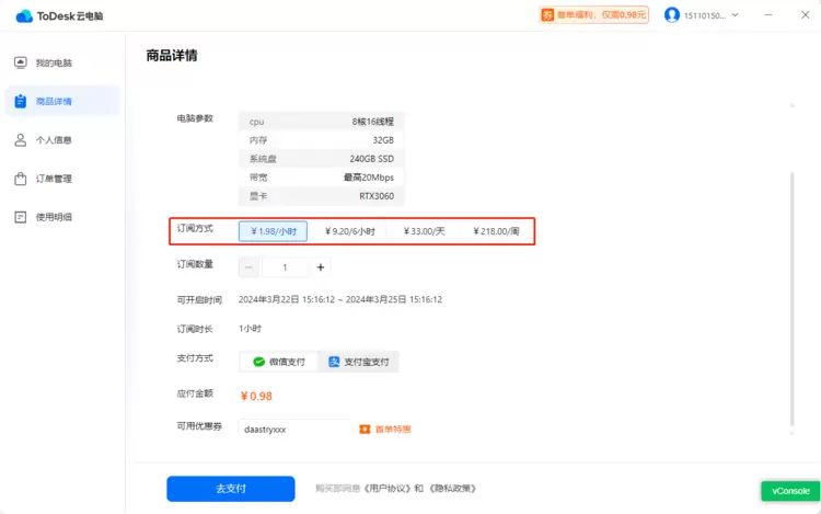 稍有了解就知道市面上其他品牌的云电脑基本动辄一天一周的购买时间;而ToDesk的云电脑使用时间可以按照小时进行购买,目前分别有1小时、6小时、包天和包周,使用者可以根据所需时间进行搭配购买,非常方便灵活。