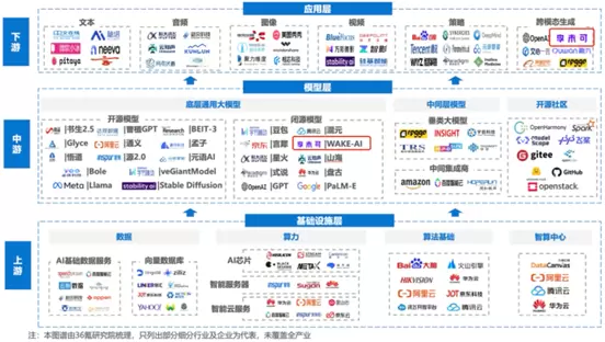 其中在36kr研究院梳理的产业图谱中,发现杭州李未可科技与字节跳动的豆包、腾讯云混元及华为云盘古等大模型等一起出现在闭源模型层,甚至在跨模态生成应用层也占据一地。