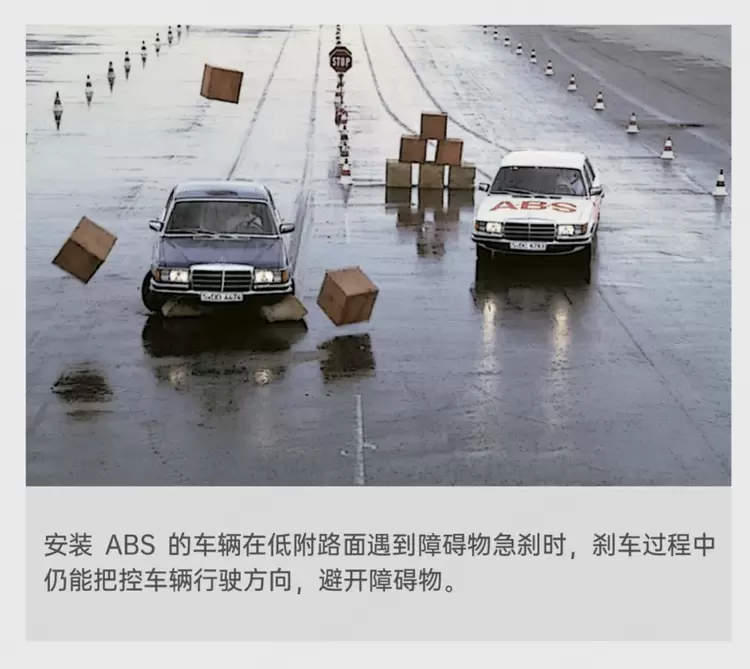 安装 ABS 的车辆在低附路面遇到障碍物急刹时,刹车过程中仍能把控车辆行驶方向,避开障碍物。