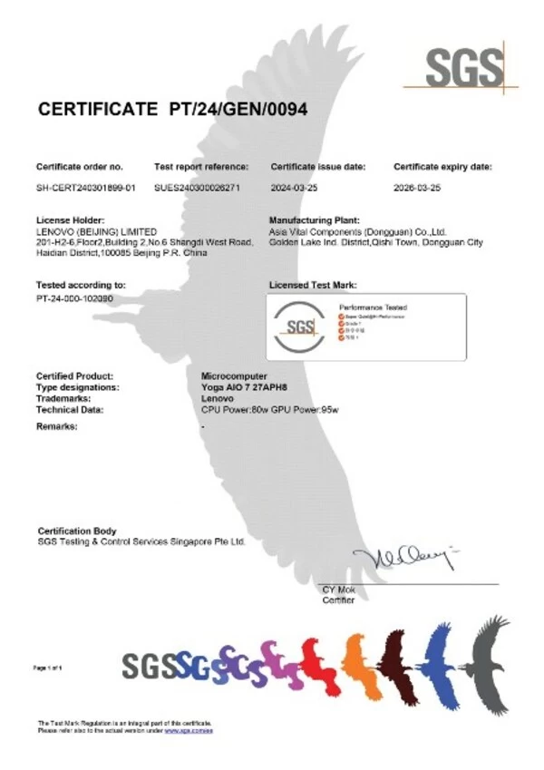 SGS持续关注市场创新技术的发展及消费者对使用品质的追求, 致力于为全行业提供优质解决方案。本次认证期间,SGS凭借全球化技术的优势,按照SGS 微型计算机噪声性能测试标准PT-24-000-102090标准要求,对联想Yoga AIO 7 27APH8的多种工作模式,如空闲模式、正常工作模式和高性能模式的噪声参数等进行了严格客观评估测试。通过SGS的综合评估,最终为联想Yoga AIO 7 27APH8签发了静享卓越 Performance Tested Mark认证证书。