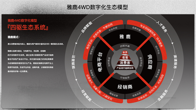 随着数字化浪潮的席卷,传统商业模式正面临着前所未有的挑战与机遇。在这一时代背景下,企业如何紧跟时代步伐,运用数字化技术重塑自身,成为决定其未来命运的关键。在大会现场,备受期待的雅鹿4WD生态系统惊艳亮相。这一独具匠心的创新模式,正是助力雅鹿集团腾飞的强大翅膀。据悉,雅鹿4WD模式以消费者体验为核心,巧妙地将品牌方、供应商(工厂)、经销商(电商运营、直播团队、线下门店)及电商平台多方力量融为一体。通过数字化技术的协同共享,雅鹿成功打造了一个平台共创、品牌共建、分销裂变的数字化生态系统。雅鹿集团精准把握数字化技术的精髓,将其灵活运用于深入洞察和快速响应消费者需求之中。这不仅显著提升了产品的品质与服务水平,更让雅鹿在瞬息万变的市场中稳步前行,持续为消费者带来超越期望的优质产品。同时,雅鹿敏锐捕捉新兴渠道与平台的发展机遇,积极布局并拓展合作伙伴网络,共同开拓更为广阔的发展前景。