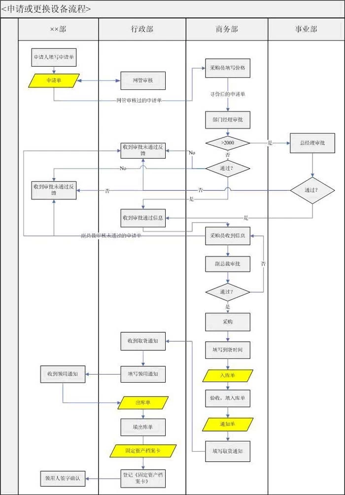下面,我们就动手来画一下吧!下图是画好的流程图,表单所在之处都用黄色做了标记。