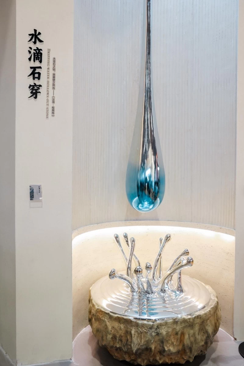 在此次展会,百得胜以“水滴石穿”文化主题融入展厅设计,巧妙地实现健康生活方式与精神文化的对话,以“水滴石穿、流水生财、木旺宅运、水木相生、疗愈花园”五大主题空间,让观展者沉浸式地感受水漆木皮的质感与高定细节,在水漆木皮美学展厅中,体验心灵与艺术的碰撞。