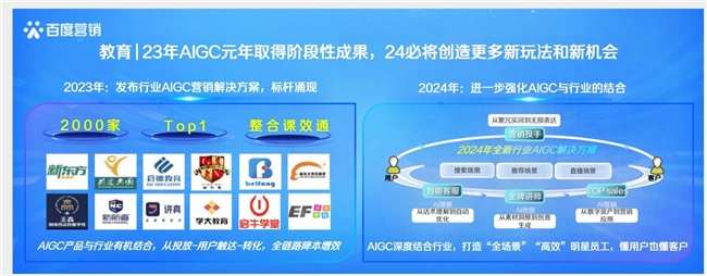2023年9月在百度教育行业AI营销论坛上,首次提出教育行业AIGC解决方案——围绕广告营销全链路,整合轻舸+擎舵+商家bot,推出新时代营销“三板斧”,教育行业客户积极进行尝试并取得了一些效果验证。24年全新升级的AIGC营销解决方案,致力于助力客户在百度场域内打造“全场景”“高效”的明星员工,在搜索、推荐、直播等业务场景中,不同的AI产品都各展技能,实现商家与用户的高效连接和优质交互。明星员工在不同场景,将以不同的角色出现在用户眼前,以更好地服务用户。