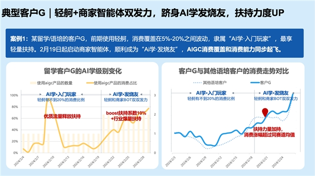 为鼓励商家尝试AIGC产品,教育行业特别策划了“AI学宝箱”活动,根据AIGC产品使用情况来撬动不同档位的扶持,特别是对于那些使用多个AI产品且消费占比达到一定程度的客户,将给予他们强大的流量支持。有超2000家客户享受到了流量红利,留学、学历、技能等多个赛道的商家在春招期间取得了较好的验证,诸多客户随着AI学等级的提升,实现新增量收入的拉动。