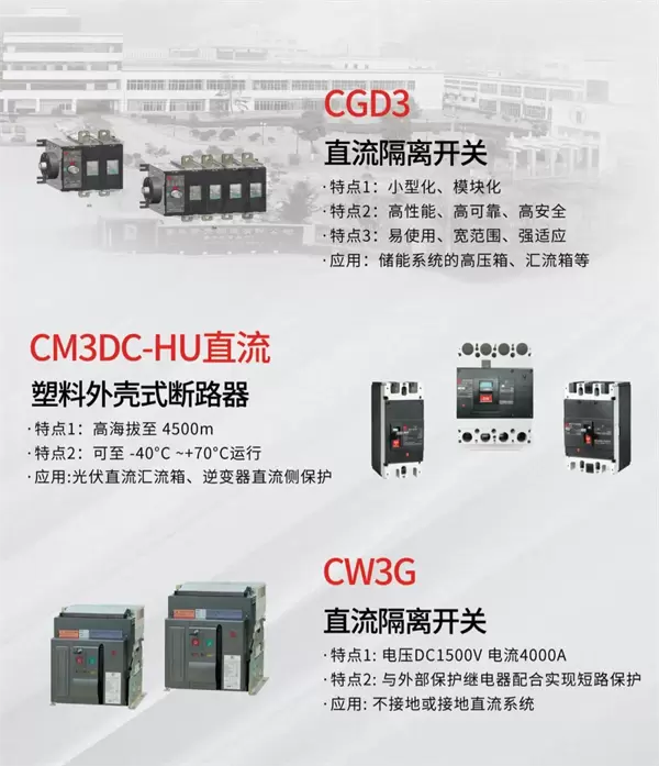 近年来,更是积极布局储能行业,重磅推出储能一站式解决方案。该方案结合了CGD3直流隔离开关、CM3DC-HU直流塑壳断路器、CW3G直流隔离开关等元器件,采用模块化设计,安装便捷,维护方便,适应多种应用场景,保证了用电的连续性。