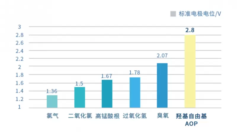 据了解,羟基自由基(-OH)高级氧化AOP消毒系统,其最大的优势就是强大的消杀能力。作为一种高效的氧化剂,羟基自由基的标准电极电势高达2.80V,这意味着它拥有极强的氧化还原能力,能够破坏池水中99%以上的有机和无机污染物,精准消杀,提高消毒效果。
