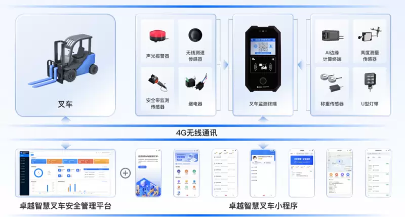 此外,卓越技术的智慧叉车解决方案,则通过采用“数字化智能终端+云端大数据平台”的创新模式,依托叉车监测终端、传感器等套件对叉车人员、设备、环境等进行全方位实时感知,变被动“监督”为主动“监控”,帮助企业规范叉车作业及车辆、司机管理,有效提升车辆、司机的工作效率,使其能及时发现生产过程中的安全隐患,降低叉车事故发生概率,从而保障人身和财产安全。