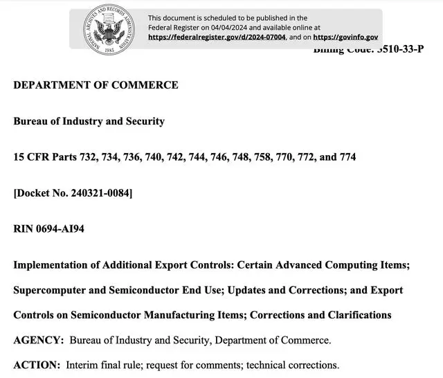 近日,美国商务部发布公告,对美国2023年10月17日发布的半导体出口管制规则进行修订,除此前限制英伟达等公司向中国出口先进的AI芯片,这次新规再次加码,对向中国出口芯片的限制也适用于包含低端芯片的笔记本电脑,标志着中国将更难获取美国人工智能芯片和芯片制造工具。