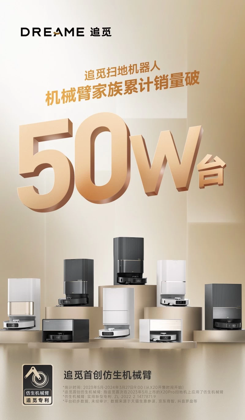 在施行高端化战略过程中,追觅科技也始终秉承着“将尖端科技应用于家庭普惠”的理念,将高维技术在全价位段的产品上进行布局。搭载仿生机械臂技术的X20系列面世后,其迅速成为扫地机行业高端爆品,同时在3K价位段的S10 Pro Ultra机械臂版上,追觅科技首次实现仿生机械臂技术下放,一举提高了扫地机器人行业的技术应用水准,为更多用户带来更便捷、智能的清洁体验。数据显示,截至2024年3月27日,追觅扫地机器人机械臂家族累计销量已经突破50万台。