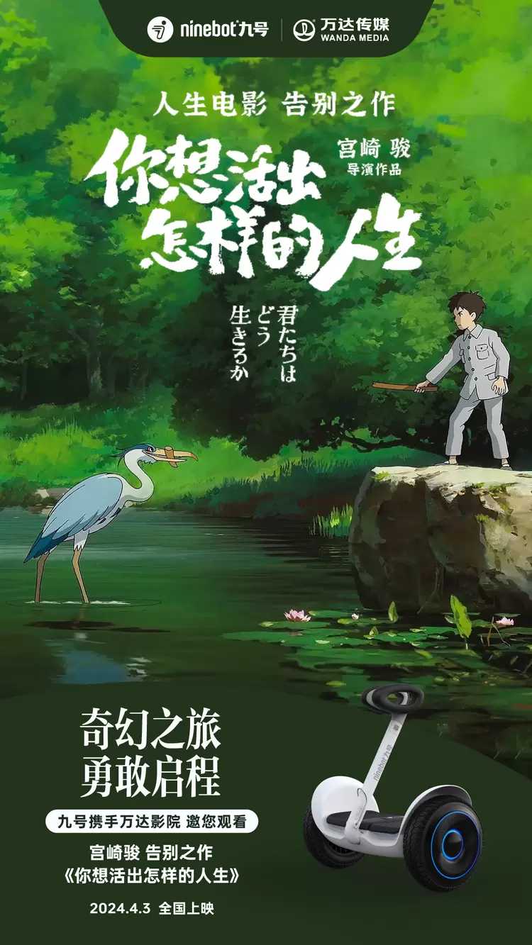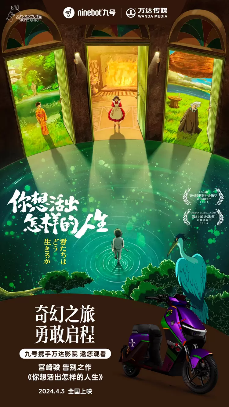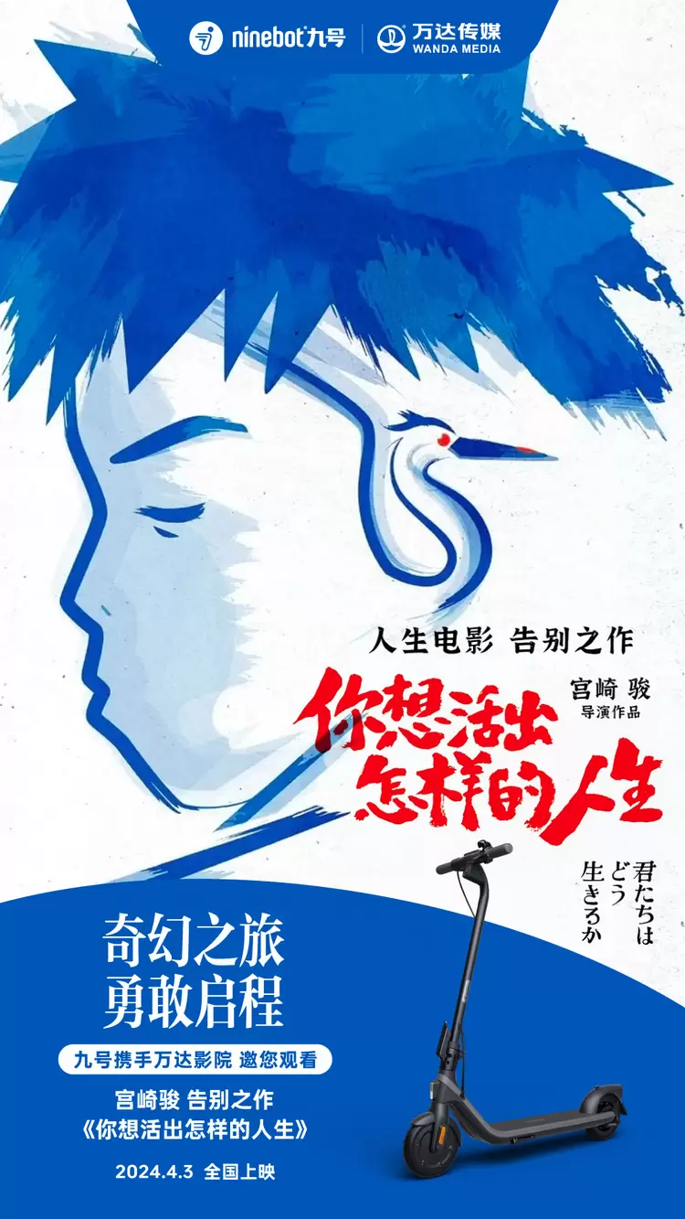 在这个春天,九号公司携手万达影院,呈献一场关于梦想、希望与告别的视觉盛宴——宫崎骏导演的告别之作《你想活出怎样的人生》,于2024年4月3日在全国万达影院热映。这不仅是一次对传奇动画大师的致敬,也是九号品牌与年轻用户、家庭观众之间的一次深情对话。