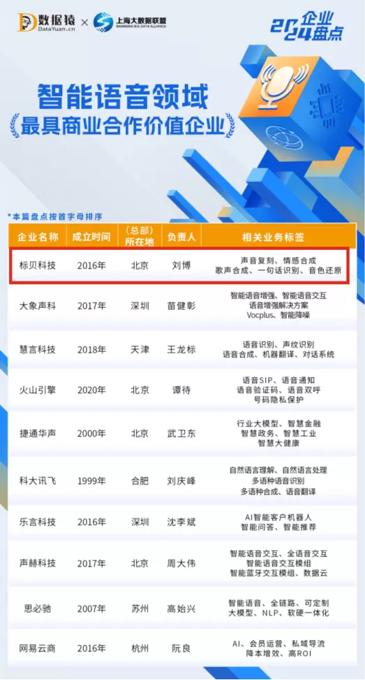 3月26日,数据猿携手上海大数据联盟发布《2024中国智能语音领域最具商业合作价值企业》榜单,标贝科技作为智能语音领域的典型代表企业强势上榜。