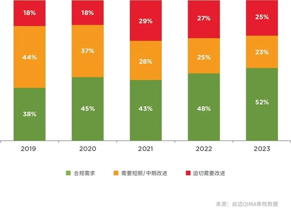 在启迈QIMA的调查中,近三分之二的受访者表示,与一年前相比,供应商合规性对他们的重要性增加,70%的受访者在采购决策中至少考虑一个ESG因素。然而,现场审核数据揭示,2023年道德合规性进展依然缓慢。四分之一接受检验的工厂获得了"红色"评级,表明需要紧急整改(2022年为27%)。健康与安全、工作时间和工资是最为突出的两个问题。