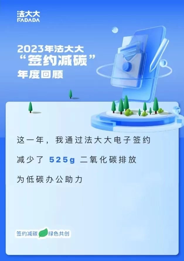 数据显示,截至2023年,法大大平台累计合同签署量已超过83亿,累计减少超147万吨的二氧化碳排放,相当于2508平方公里森林的固碳量。
