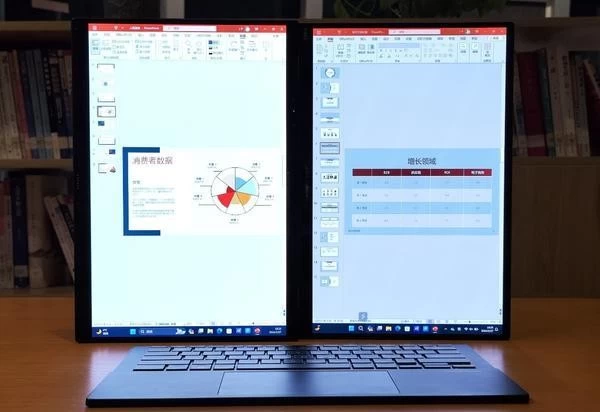 在重力感应的支持下,只需将双屏竖放就进入了“竖屏模式”。近20英寸的显示面积,已与桌面PC的大屏显示器体验无异。当用户做项目汇报、述职报告、数据对比时,更大的视野,更趋自然的左右分屏、上下滚动等操作方式,让图表和数字的展现都变得一目了然。
