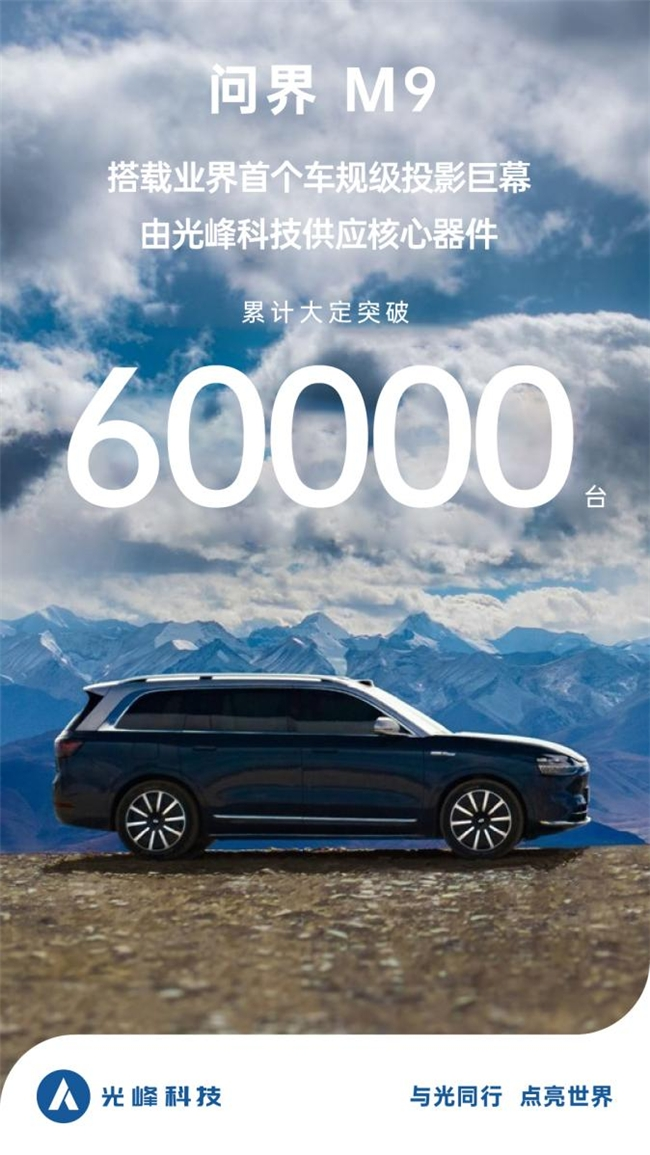 2023年12月,光峰科技首个定点车型赛力斯问界M9正式发布,光峰科技与其合作产品为车规级投影巨幕,正进入量产交付阶段。据媒体报道最新消息,问界M9累计大定已突破60000台。