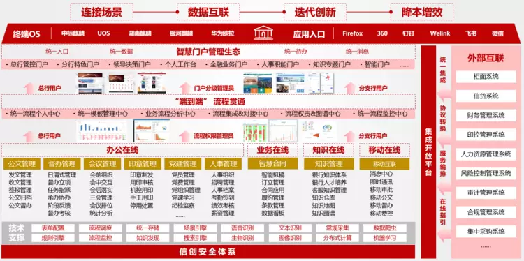 顺应银行数字化转型趋势,结合服务众多银行的成功经验,蓝凌推出银行信创数智化协同解决方案,助力银行构建全栈信创办公平台,赋能银行安全办公、管理升级、应用合规,增强自主可控能力。