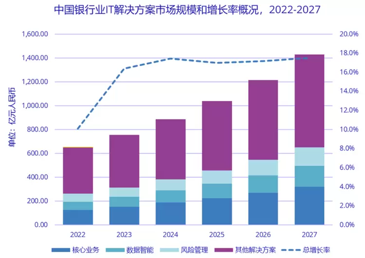 据统计,2022年中国银行业IT解决方案市场规模为648.8亿元人民币,与2021年的589.3亿元人民币相比,同比增长10.1%。IDC预计,到2027年,中国银行业IT解决方案市场规模将达到1429.15亿元人民币,年复合增长率为17.1%。在政策推进、技术持续创新等诸多效应的叠加下,未来三到五年中国银行业IT解决方案市场将会继续保持增长态势。