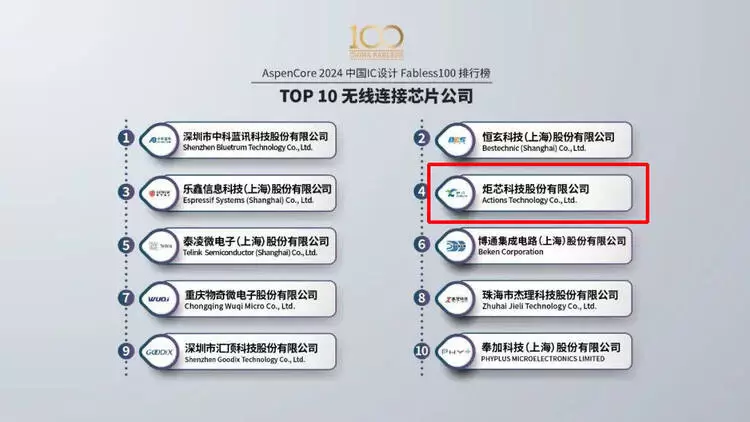 炬芯科技上榜2024 中国IC设计Fabless 100 排行榜之TOP 10无线连接公司