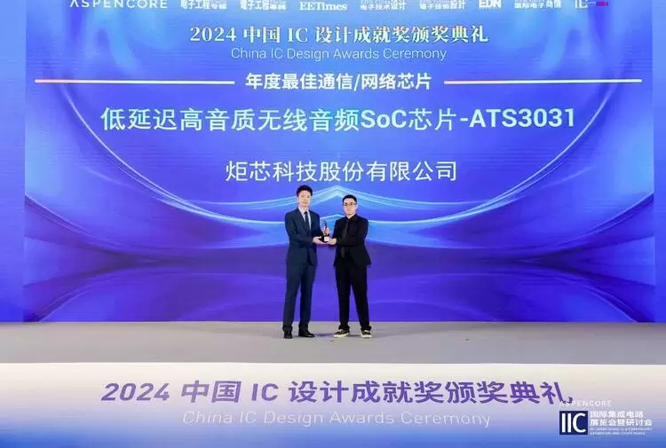 此外,凭借卓越的性能优势以及优秀的市场表现,炬芯科技低延迟高音质无线音频SoC芯片ATS3031在2024中国IC设计成就奖颁奖典礼上荣获“2024年度中国IC设计成就奖之热门IC产品奖:年度最佳通信/网络芯片”。