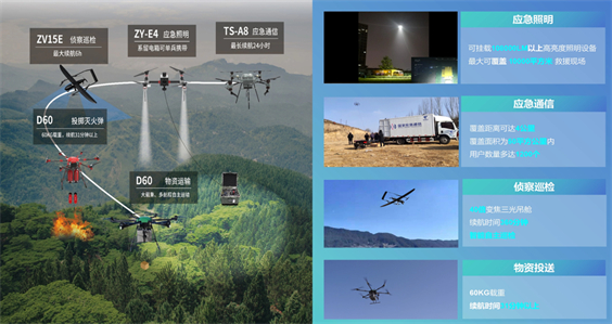 此外,D60多旋翼无人机60KG载重、续航31分钟的特性,还能在火情现场快速运输物资,确保消防物料源源不断抵达一线灭火现场,为消防人员带来可靠的后勤保障。